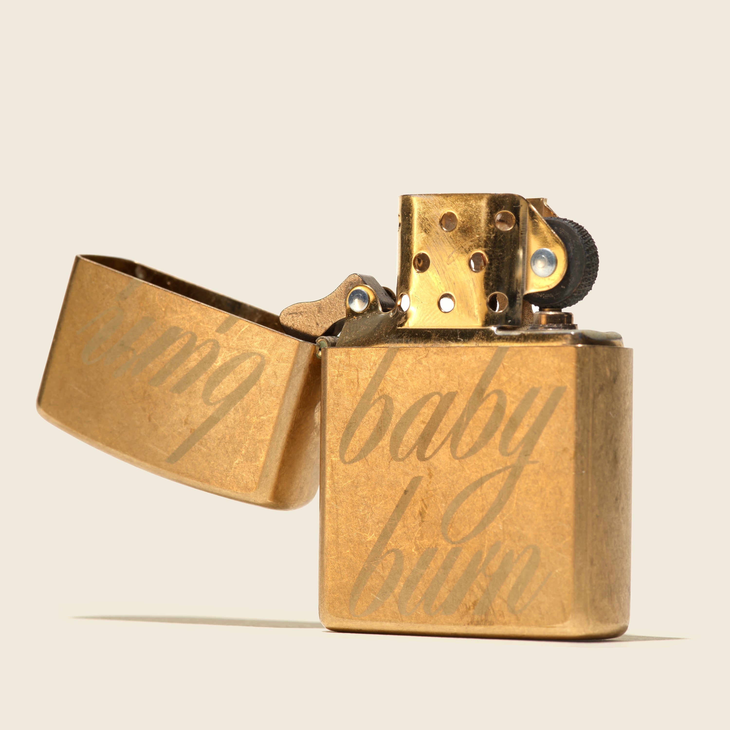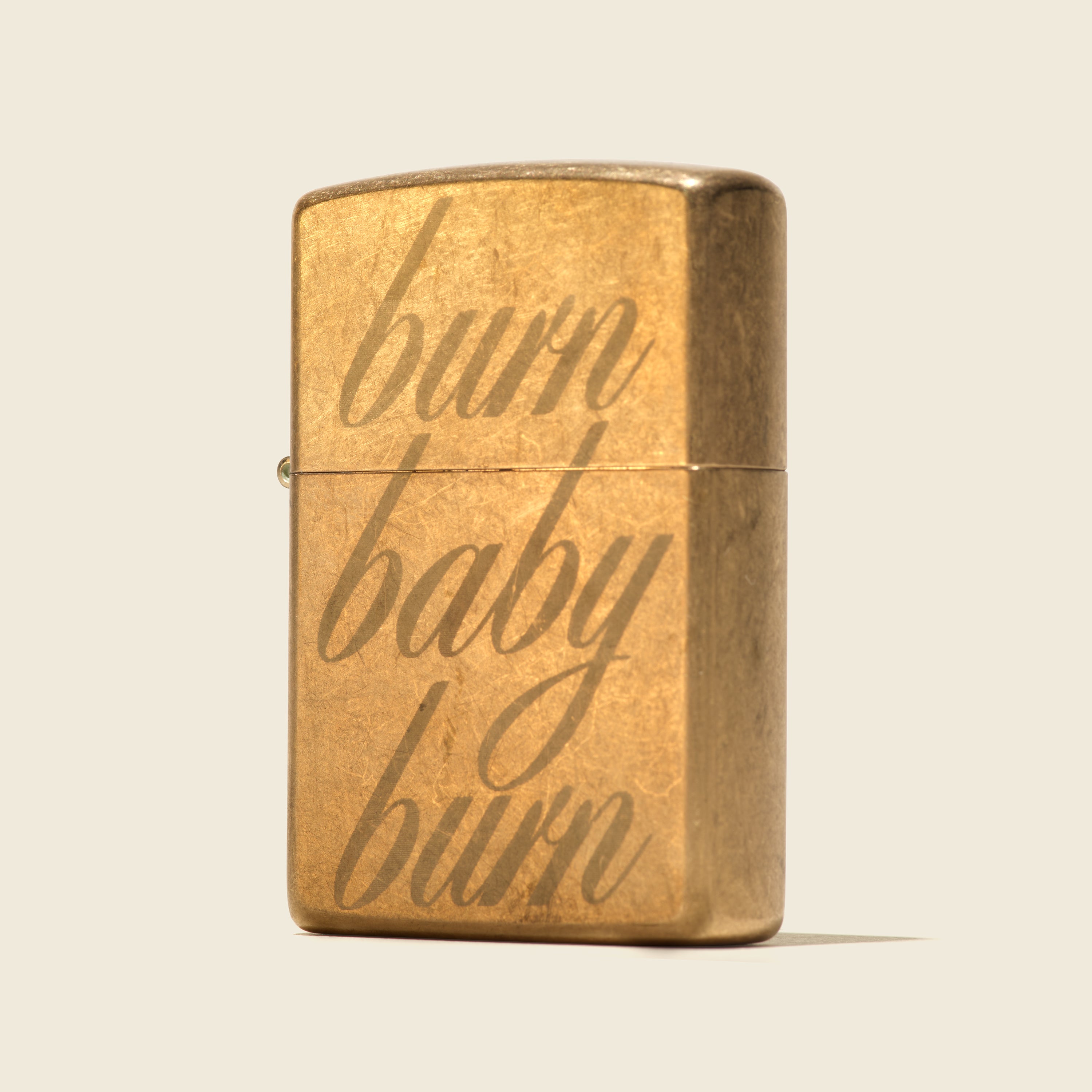 Meet the match to your ritual. Our limited edition Burn Baby Burn lighter is a solid brass Zippo with a vintage gold patina and engraved script that feels equal parts glam and grounded.