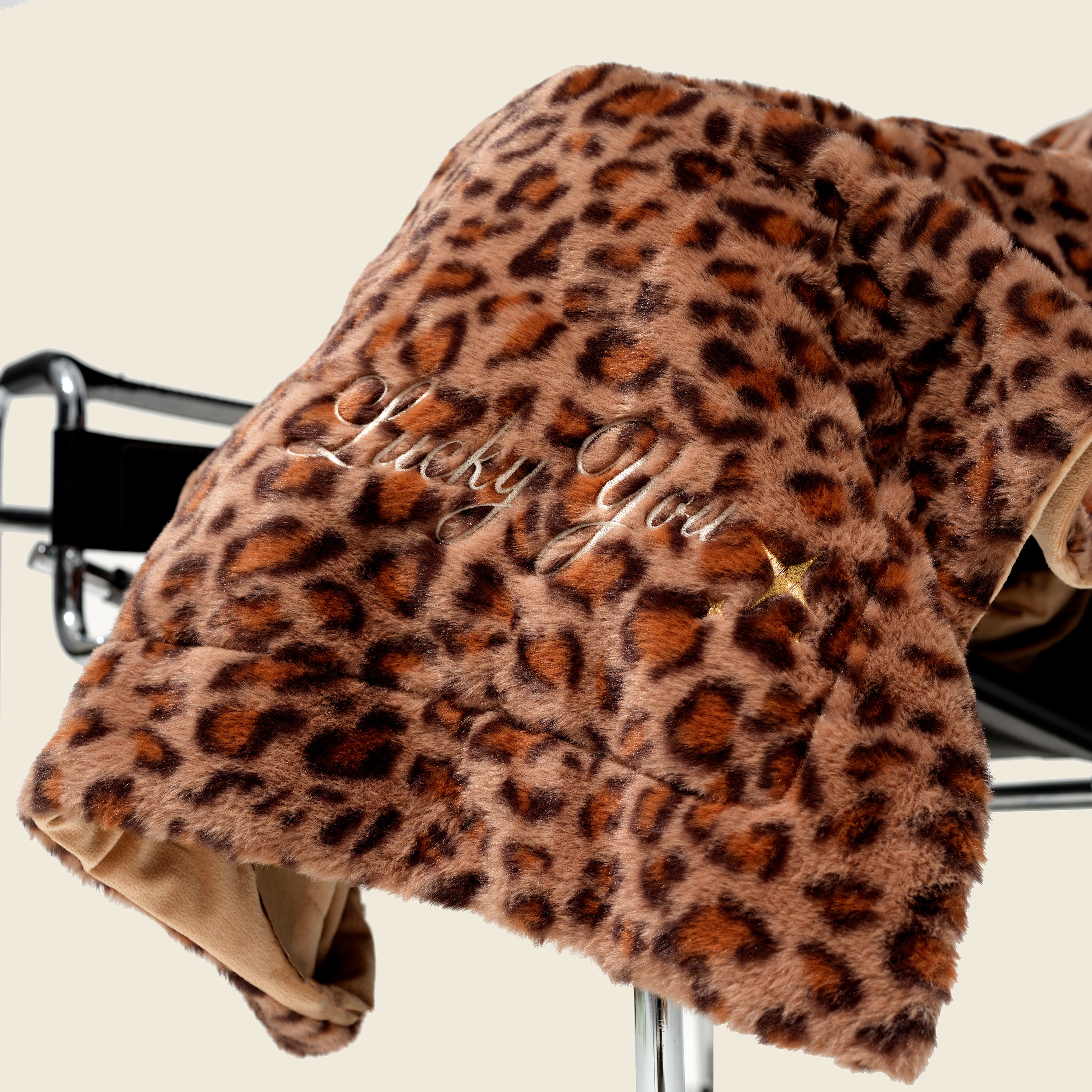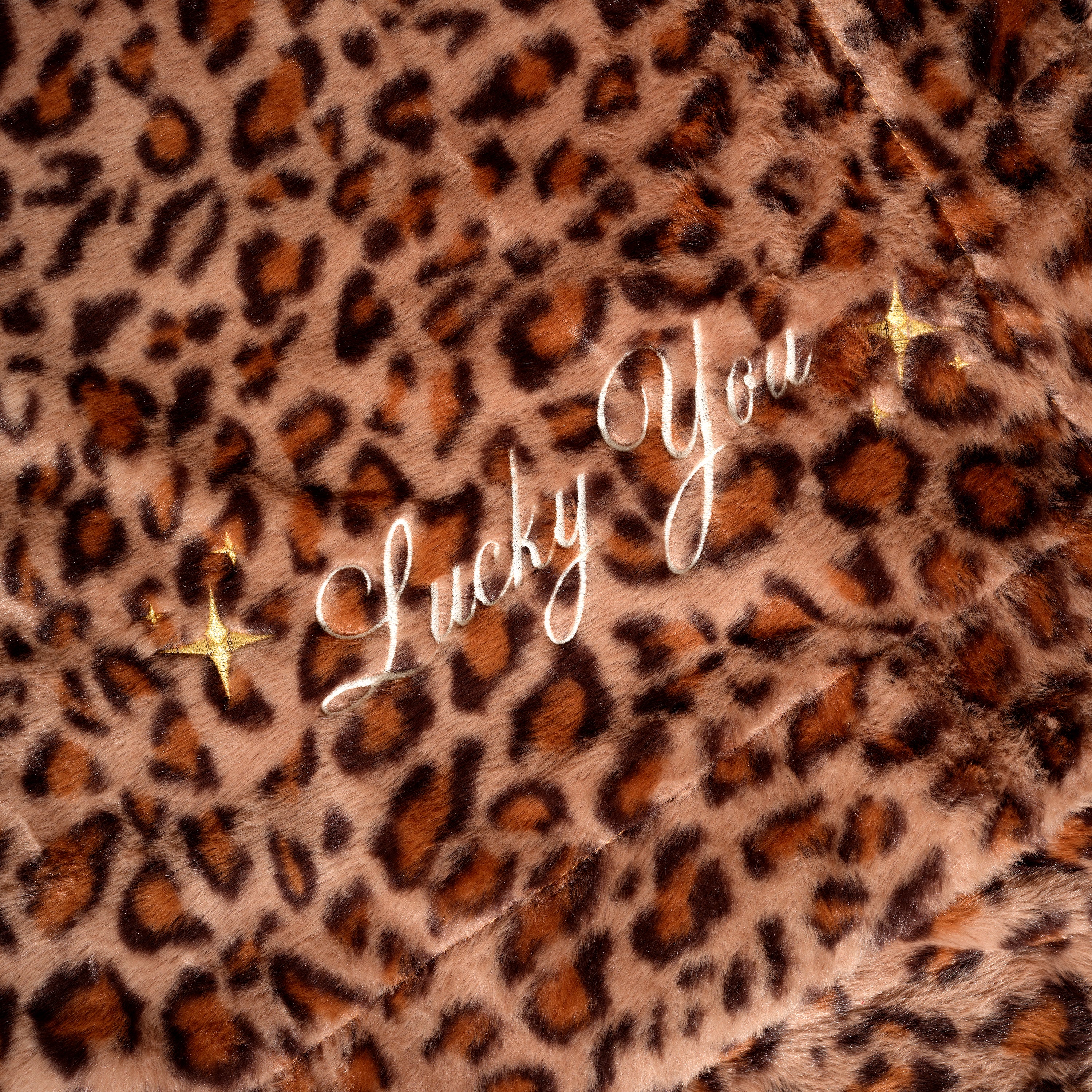 Plush and velvety with a rich leopard pattern, this blanket feels like slipping into your favorite indulgent mood. Embroidered with Lucky You in satin script and finished with our signature gold star, a little wink to the magic you deserve.