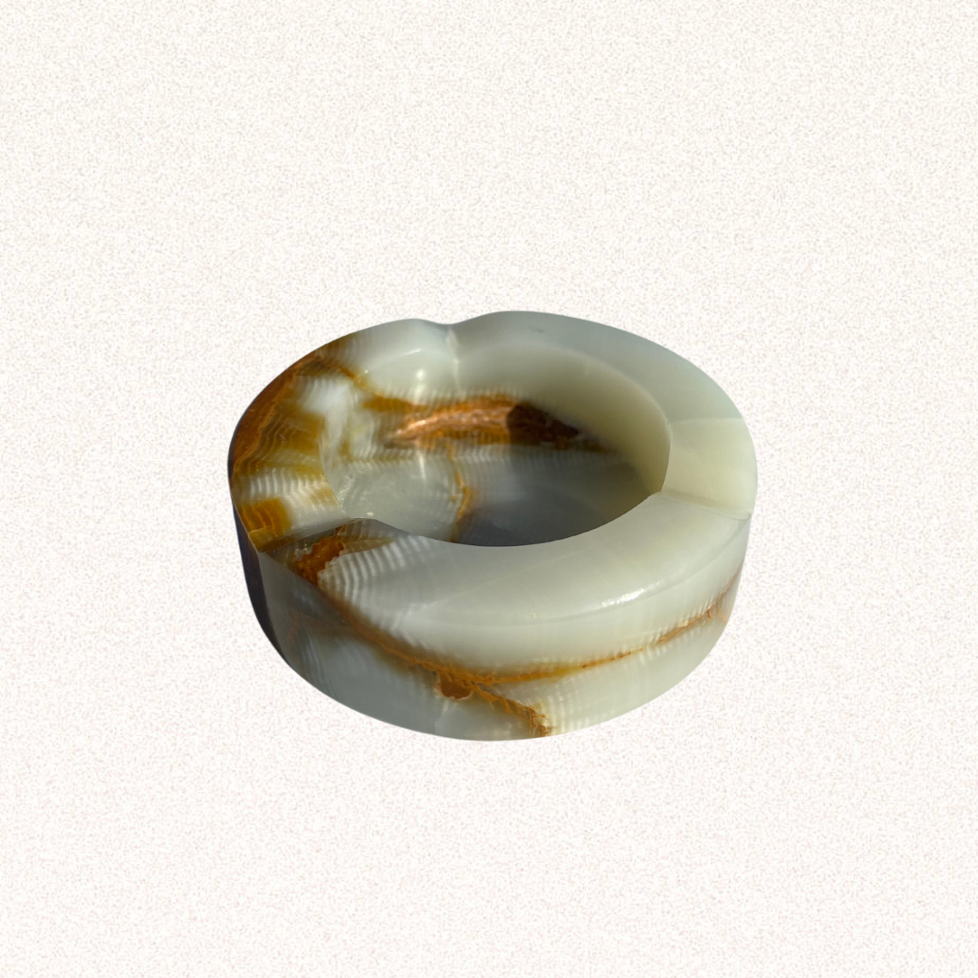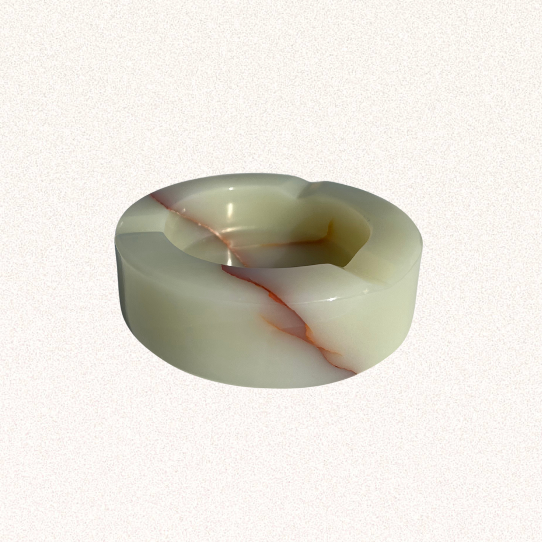 Elevate your rituals with Peach Honey’s exquisite green onyx marble ashtrays. Crafted from premium onyx stone, these ashtrays are a luxurious addition to any space. Measuring 4 inches in diameter and 1.25 inches tall, each piece is uniquely marbled, showcasing the natural variations of green onyx. No two are the same, making each ashtray a one-of-a-kind work of art.